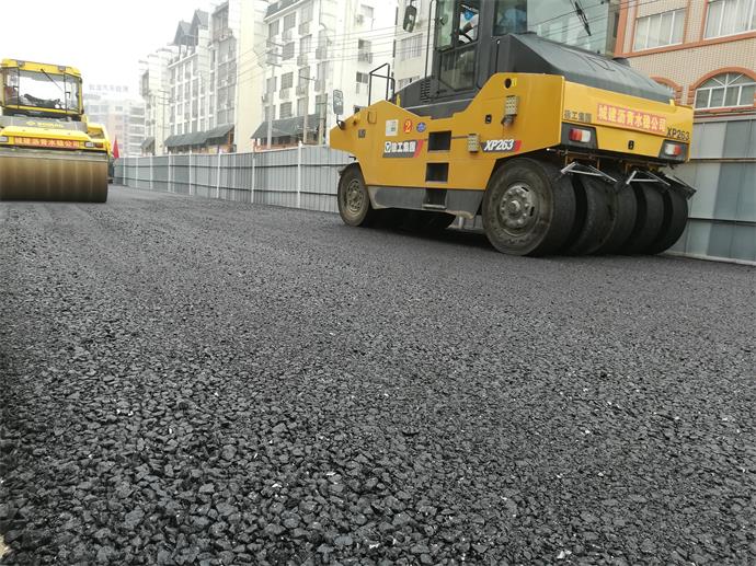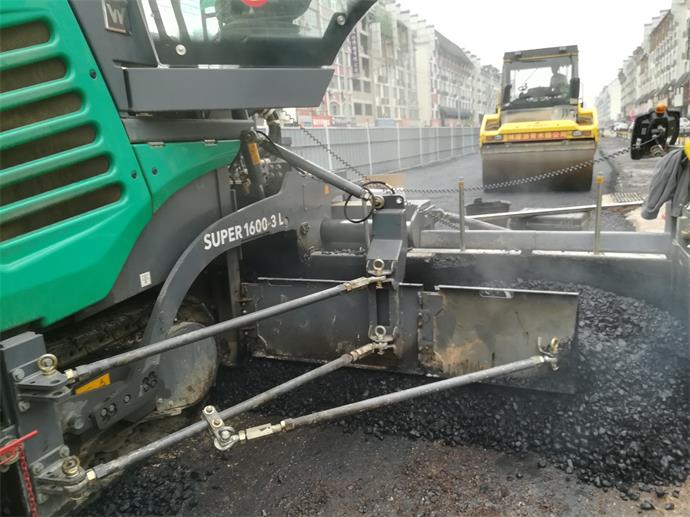 圖為機動車道粗粒式瀝青調(diào)平層攤鋪施工及光輪壓路機初壓現(xiàn)場