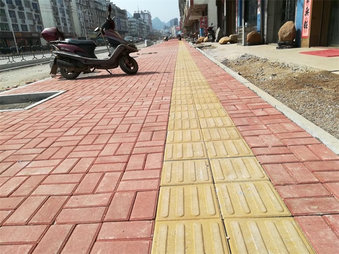 上圖為K0+220~K1+900段左幅(長(zhǎng)1680m)已完成人行道盲磚,透水磚施工