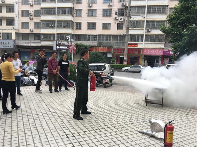 圖為賀州市消防支隊(duì)培訓(xùn)基地副主任林必偉演示如何使用滅火器