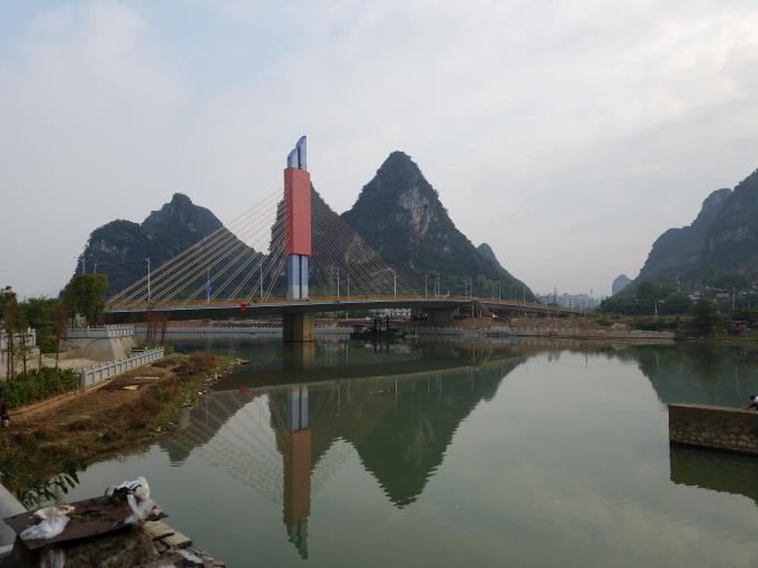 賀州市靈峰大橋工程位于八步區(qū)賀江一橋下游0.9公里處,北岸接靈峰北路,是連接賀江兩岸、緩解城市交通壓力、方便居民的重要通道之一。靈峰大橋設計全長為465.018米,其中南引道長50.448米,北引道長80.570米,引道全長131.018米,橋梁長度為334米,橋面寬度27米,按雙向四車道設計。主橋采用獨塔單索面預應力混凝土展翅箱梁斜拉橋,邊跨跨徑68米,主跨跨徑86米,全長154米。橋面以上塔高51米,全橋設計共有77根樁基、9個承臺、7個墩身、2個橋臺。