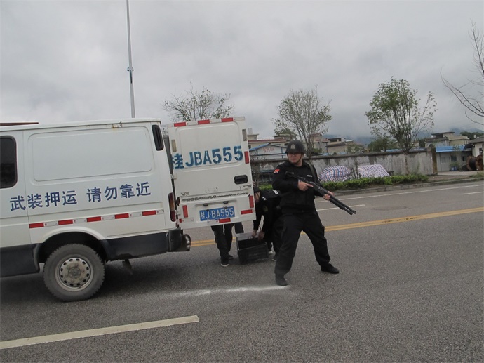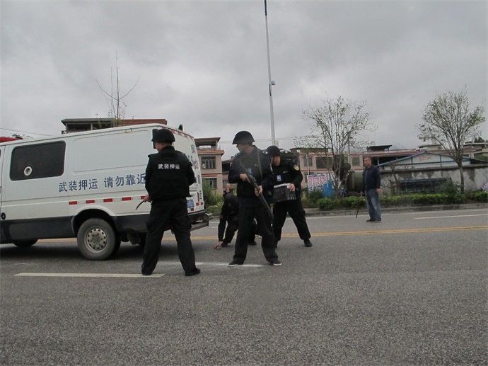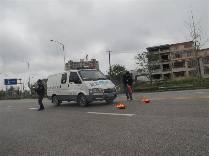演練按車組守押員崗位職責分工分步驟進行。首先是駕駛員或車組人員發(fā)現(xiàn)車輛發(fā)動機火情后,一名守押員迅速下車警戒,確認押運車輛周圍無安全隱患時敲擊車門示意車組其它人員。接到示意后,駕駛員立即提著滅火器下車迅速對押運車輛發(fā)動機及車輛前方著火點進行有效滅火。此時,中隊長判斷火情隱患情況,在確認火情有可能威脅到車上守押錢款安全的情況下,果斷下令守押員作好警戒,護送解款員迅速且有效地將車上錢款快速地轉(zhuǎn)移到車輛后方30-50米外的安全地帶。與此同時,中隊長立即向公司匯報,請求公司支援。轉(zhuǎn)移錢款的車組全體人員處于臨戰(zhàn)狀態(tài),等待公司救援,確保守押錢款安全。