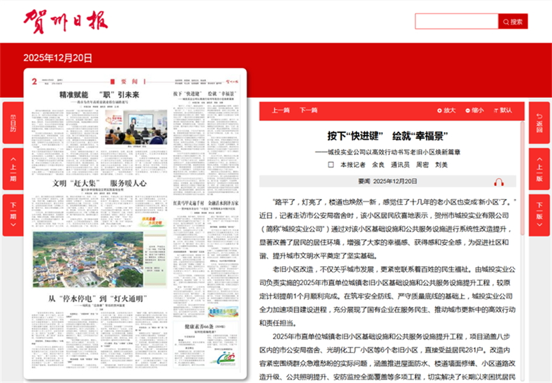 發(fā)布時(shí)間:2025-12-22 作者:文字:賀州日?qǐng)?bào) 來(lái)源:本站原創(chuàng) 審核:“路平了,燈亮了,樓道也煥然一新,感覺住了十幾年的老小區(qū)也變成‘新小區(qū)’了。”近日,記者走訪市公安局宿舍時(shí),該小區(qū)居民欣喜地表示,賀州市城投實(shí)業(yè)有限公司(簡(jiǎn)稱“城投實(shí)業(yè)公司”)通過對(duì)該小區(qū)基礎(chǔ)設(shè)施和公共服務(wù)設(shè)施進(jìn)行系統(tǒng)性改造提升,顯著改善了居民的居住環(huán)境,增強(qiáng)了大家的幸福感、獲得感和安全感,為促進(jìn)社區(qū)和諧、提升城市文明水平奠定了堅(jiān)實(shí)基礎(chǔ)。