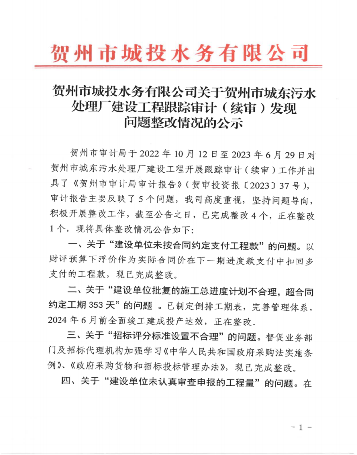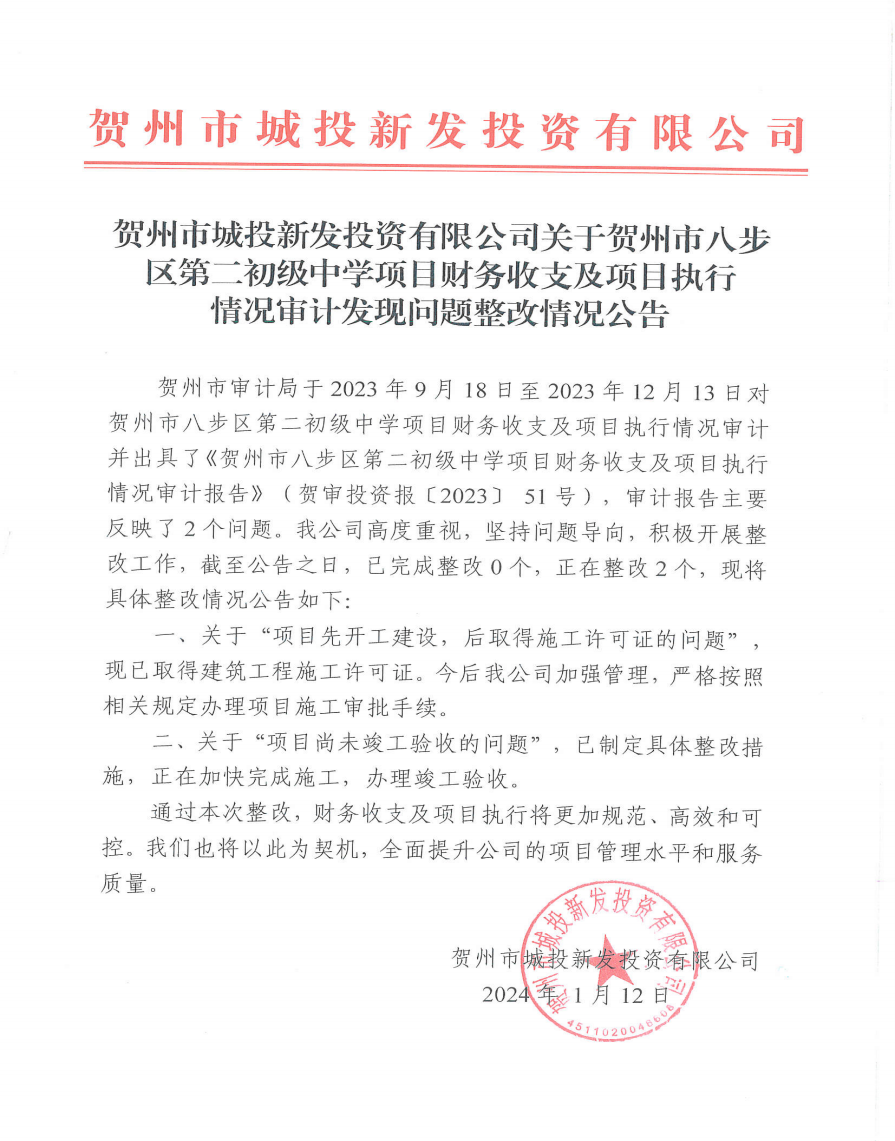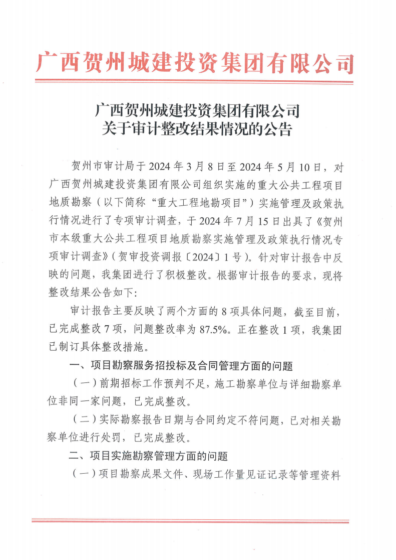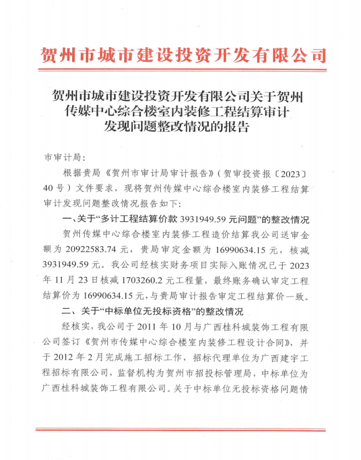 中共廣西賀州城建投資集團(tuán)有限公司委員會(huì)關(guān)于市委第四巡察組巡察反饋意見整改情況通報(bào)2025-12-30