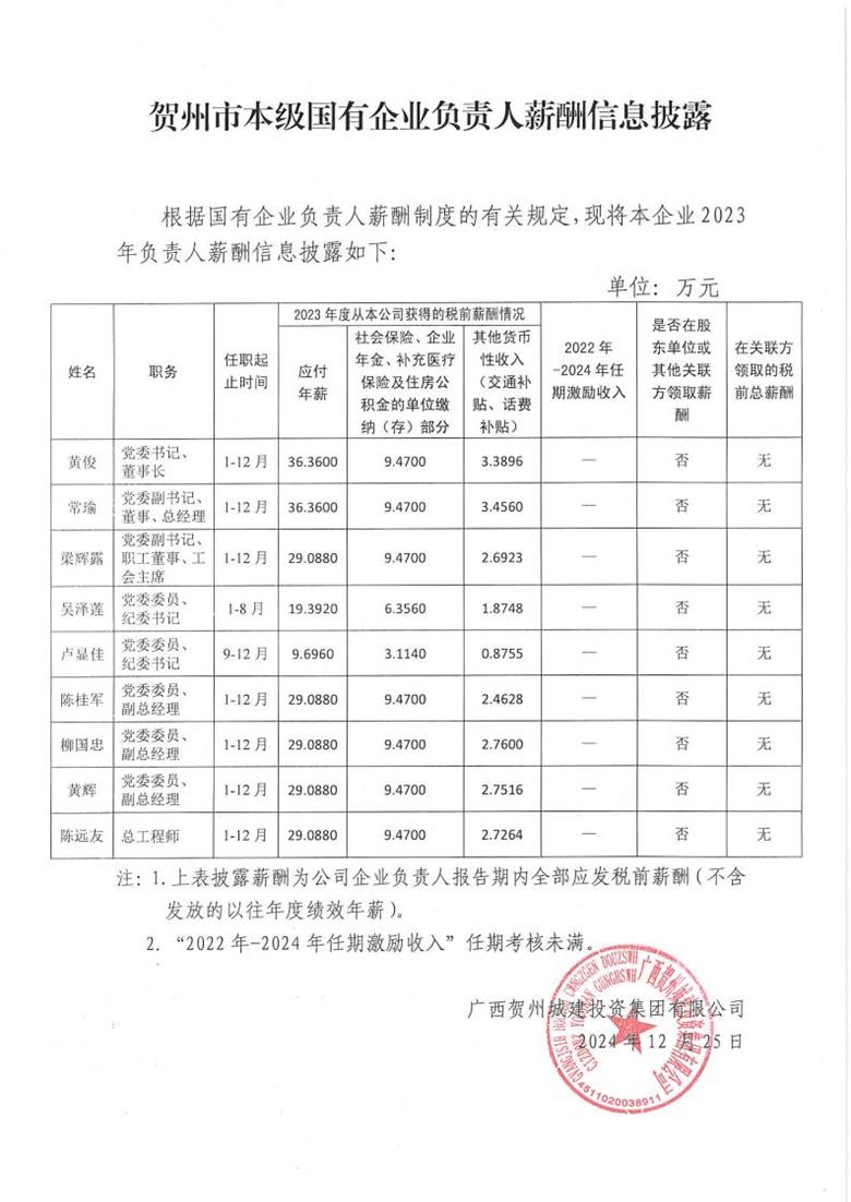 賀州市本級(jí)國有企業(yè)負(fù)責(zé)人薪酬信息披露2024-12-25