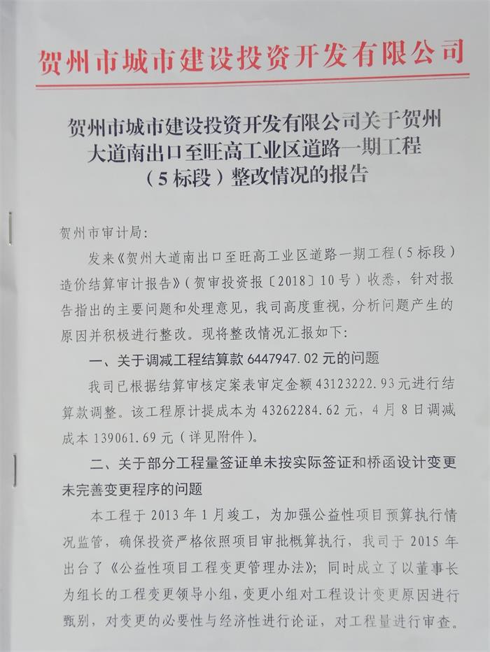 附件一:關(guān)于賀州市靈峰大橋工程建設(shè)項(xiàng)目竣工決算審計(jì)整改情況的報告 pdf